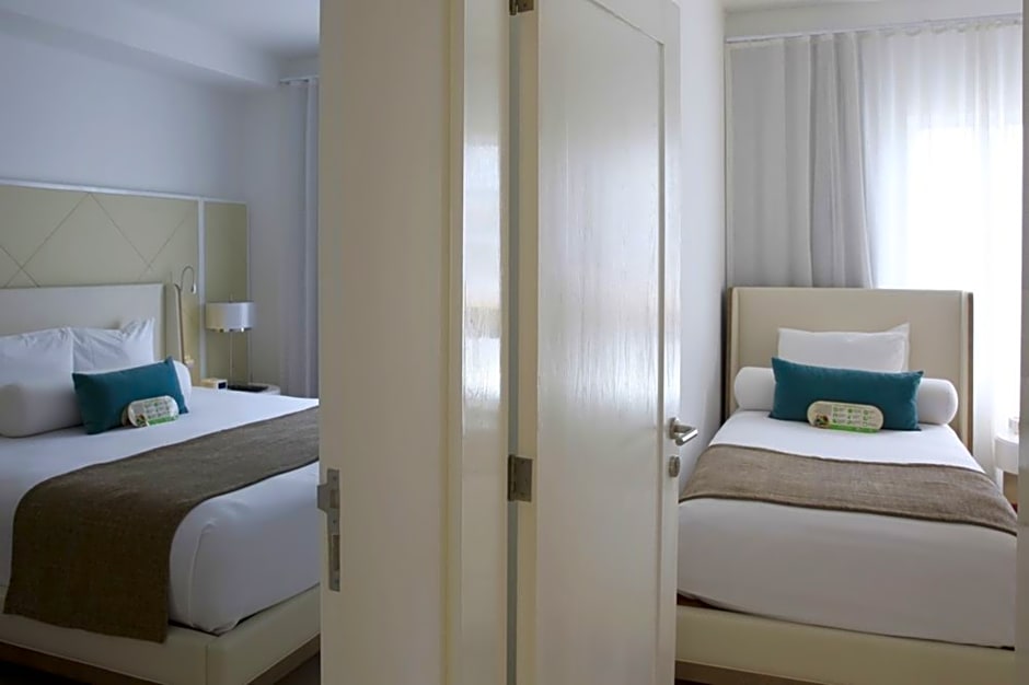 Discover luxury and comfort in our Two Bedroom Suite. With 818 sqft of space, this suite offers an ocean view, private bathroom, balcony, bathtub, and a terrace. Enjoy the convenience of a minibar, flat-screen TV, and air conditioning. Indulge in a relaxing stay with modern amenities and beautiful surroundings.